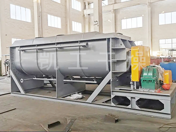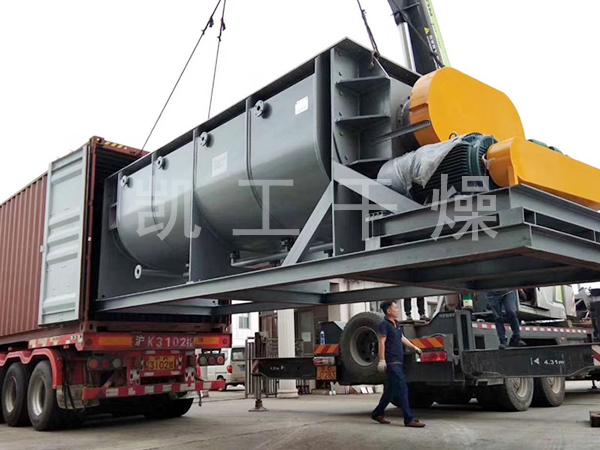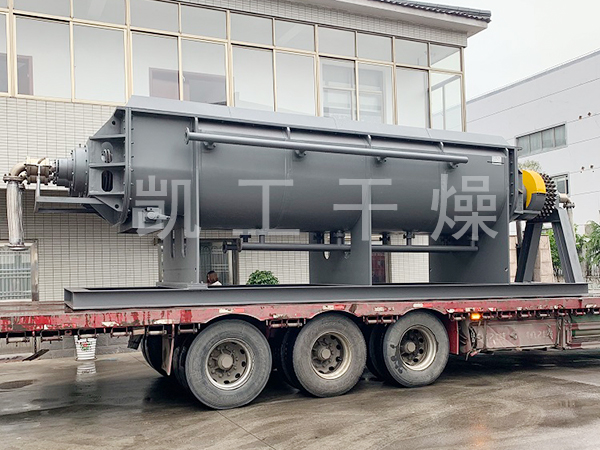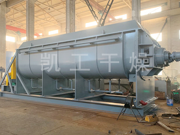 空心軸上密集排列著楔型中空漿葉,熱介質經空心軸流經漿葉。單位有效容積內傳熱面積很大,熱介質溫度從-40℃到320℃,可以是水蒸汽,也可以是液體型:如熱水、導熱油等。間接傳導加熱,沒有攜帶空氣帶走熱量,熱量均用來加熱物料。熱量損失僅為通過器體保溫層向環境的散熱。楔型漿葉傳熱面具有自清潔功能。物料顆粒與楔型面的相對運動產生洗刷作用,能夠洗刷掉楔型面上附著物料,使運轉中一直保持著清潔的傳熱面。漿葉干燥機的殼體為Ω型,殼體內一般安排二到四根空心攪拌軸。殼體有密封端蓋與上蓋,防止物料粉塵外泄而充分發揮作用。